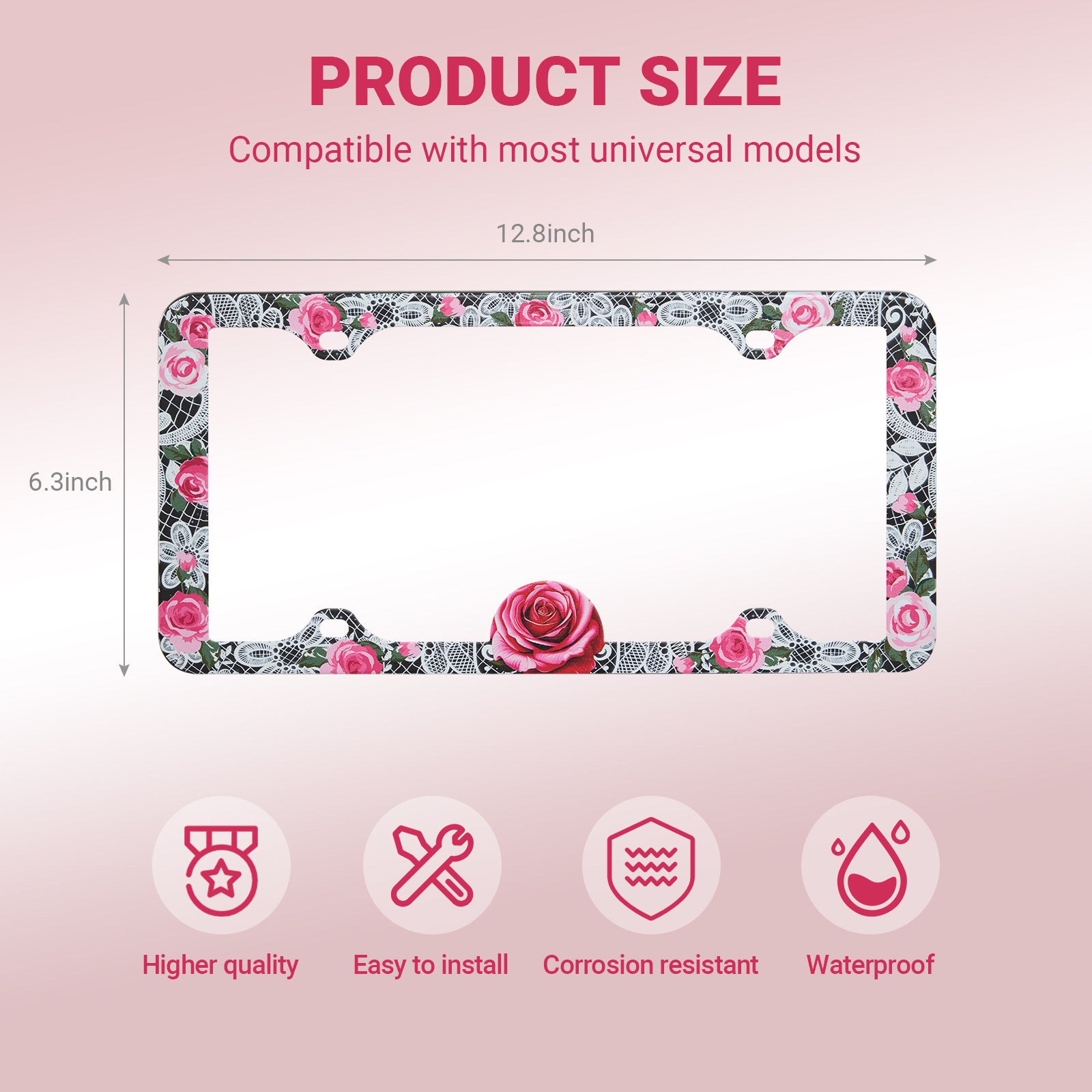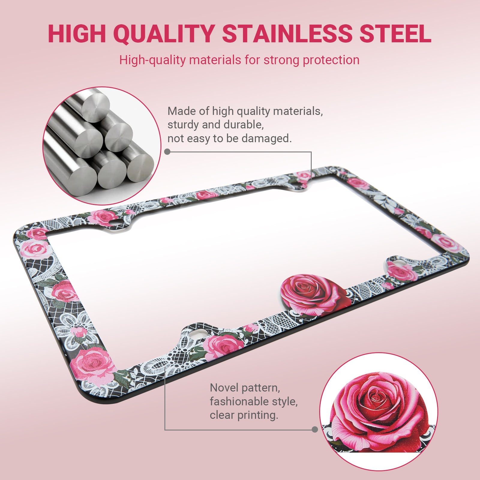 Stainless Metal Car License Plate Frame Cover - Rose Lace (2 PCS)